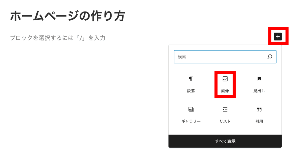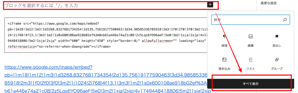 ワードプレスに戻り、ブロックの右端の「+」マークをクリックし、「すべてを表示」をクリックし、