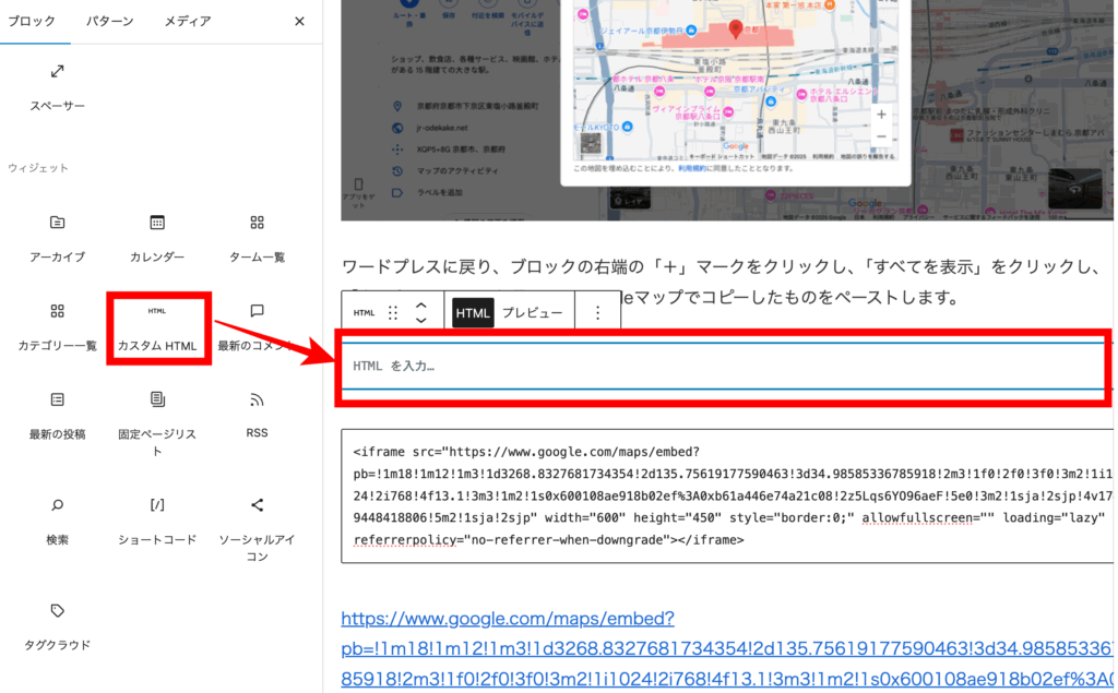 「カスタムHTML」を選んで、Googleマップでコピーしたものをペーストします。