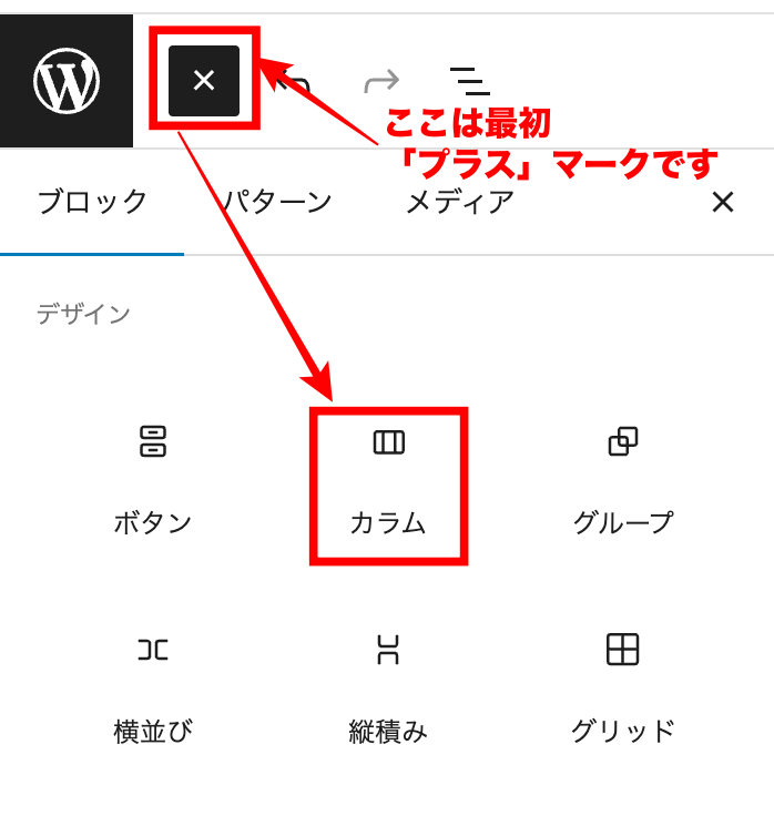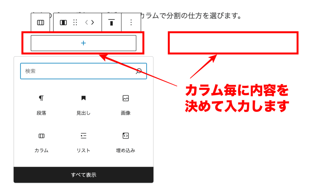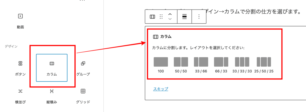 左上のプラスボタン→デザイン→カラムで分割の仕方を選びます。
