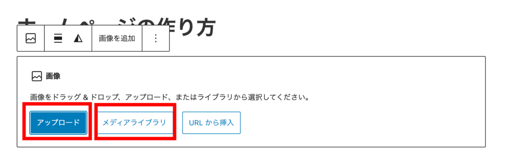 画像をアップロードする場合はアップロード、すでにホームページを作るときに使ったことのある画像はメディアライブラリに入っているのでそちらから選択してください。