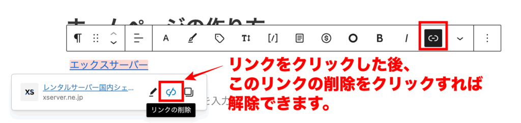リンクを貼っている部分をクリックし、リンクをクリックした後、リンクの削除をクリックすれば解除できます。